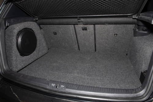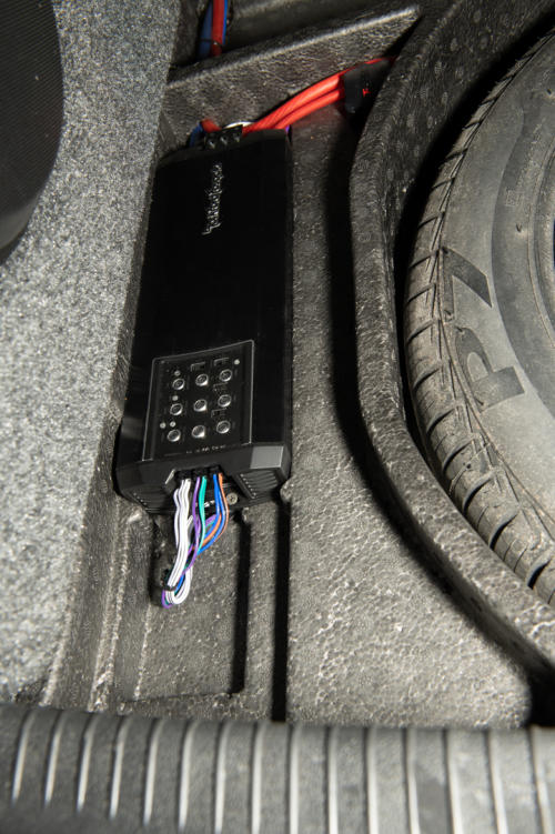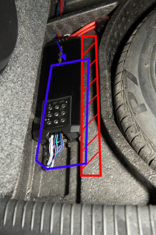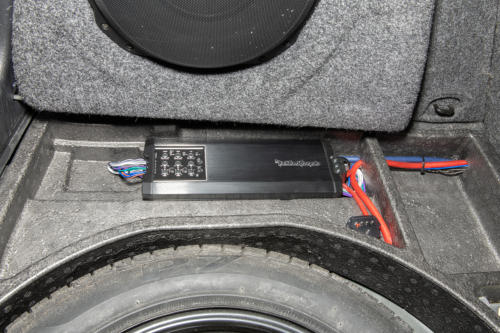 This shows the first, stealth, installation of the Rockford-Fosgate T1000X5ad amplifier beneath the hatch in my 2010 VW GTI.